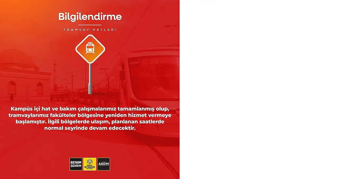 Konya Büyükşehir Belediyesi Afet Koordinasyon Merkezi sosyal medya hesabından yaptığı paylaşımla Konya'da toplu taşıma ulaşımının bel kemiği olan tramvaylar hakkında Konyalıları bilgilendirdi.Selçuk Üniversitesi Kampüsü'nde ray bakım onarımı sebebiyle 19