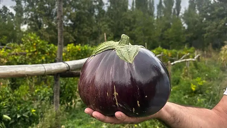 Bağkonak köyünde çiftçilik yapan emekli devlet memuru Mehmet Aydın, hobi bahçesindeki sebzeleri toplamak için gittiğinde büyük bir patlıcan olduğunu fark etti.