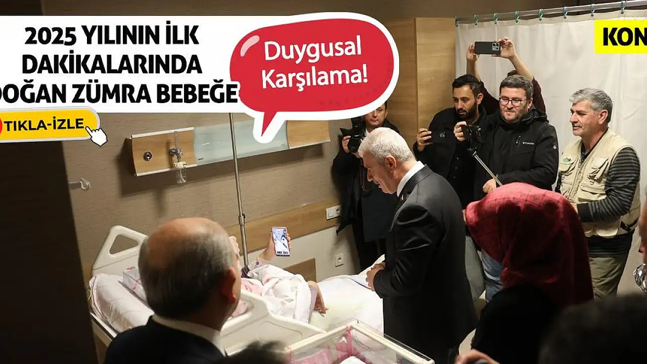 Konya'da Rukiye ve Emre Yorgancı çifti, ikinci çocukları olan Zümra bebeğe 2025 yılının ilk dakikalarında kavuştu. Zümra bebek, Dr. Ali Kemal Belviranlı Kadın, Doğum ve Çocuk Hastalıkları Hastanesi'nde saat 00.01'de normal doğumla 3 kilo 250 gram ağırlığında dünyaya geldi. Bebeği Adana'da görevde olan uzman çavuş babasına Konya Valisi İbrahim Akın görüntülü arayarak gösterdi.