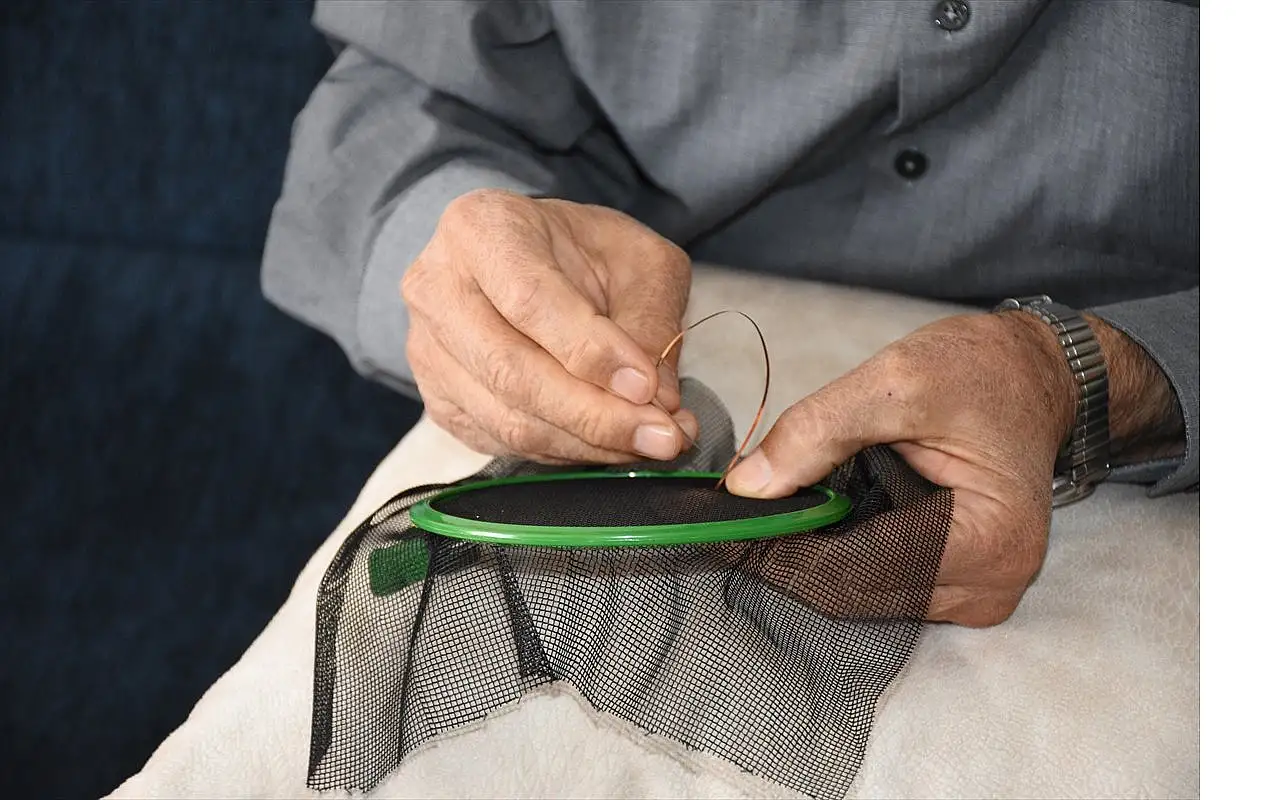 "Tel kırma yapmak beni dinlendiriyor. 'Müzik ruhun gıdasıdır' derler ya ben de tel kırma yaparken vaktin nasıl geçtiğini hiç bilemiyorum. Eğilerek yapıldığı için ara ara kalkıp kendimi dinlendiriyorum. Gözlüksüz yapamıyorum, mecburen yakın gözlüğümü takıyorum. Hiç yılmadım, 'Bu bana zor geliyor' demedim. Ben ince işlerden çok hoşlanan bir kişiyim. Kaba işi zaten yapamam. Sergide duyanlar 'Burada bir amca besmele işlemiş, tel kırma yapmış' diye geliyor. Beni de görünce teşekkür ediyorlar, bu yaşta bu işi yapabilmem onlar için mucize gibi bir şey."