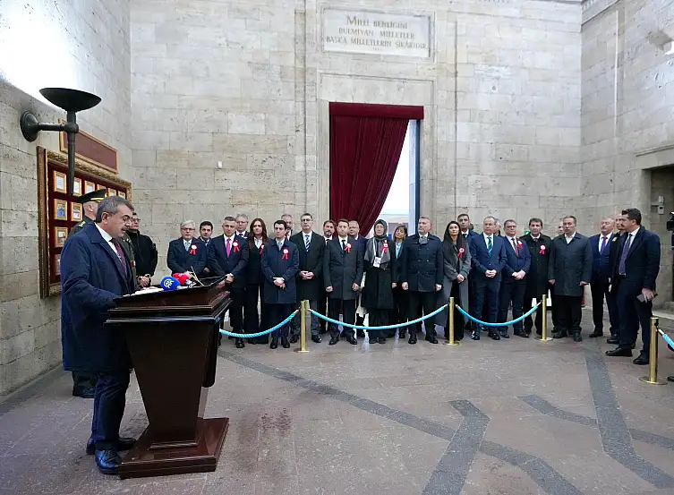Tekin başkanlığındaki Bakanlık bürokratları ile öğretmenlerden oluşan heyet, Aslanlı Yol'dan yürüyerek Büyük Önder Gazi Mustafa Kemal Atatürk'ün mozolesine geldi.