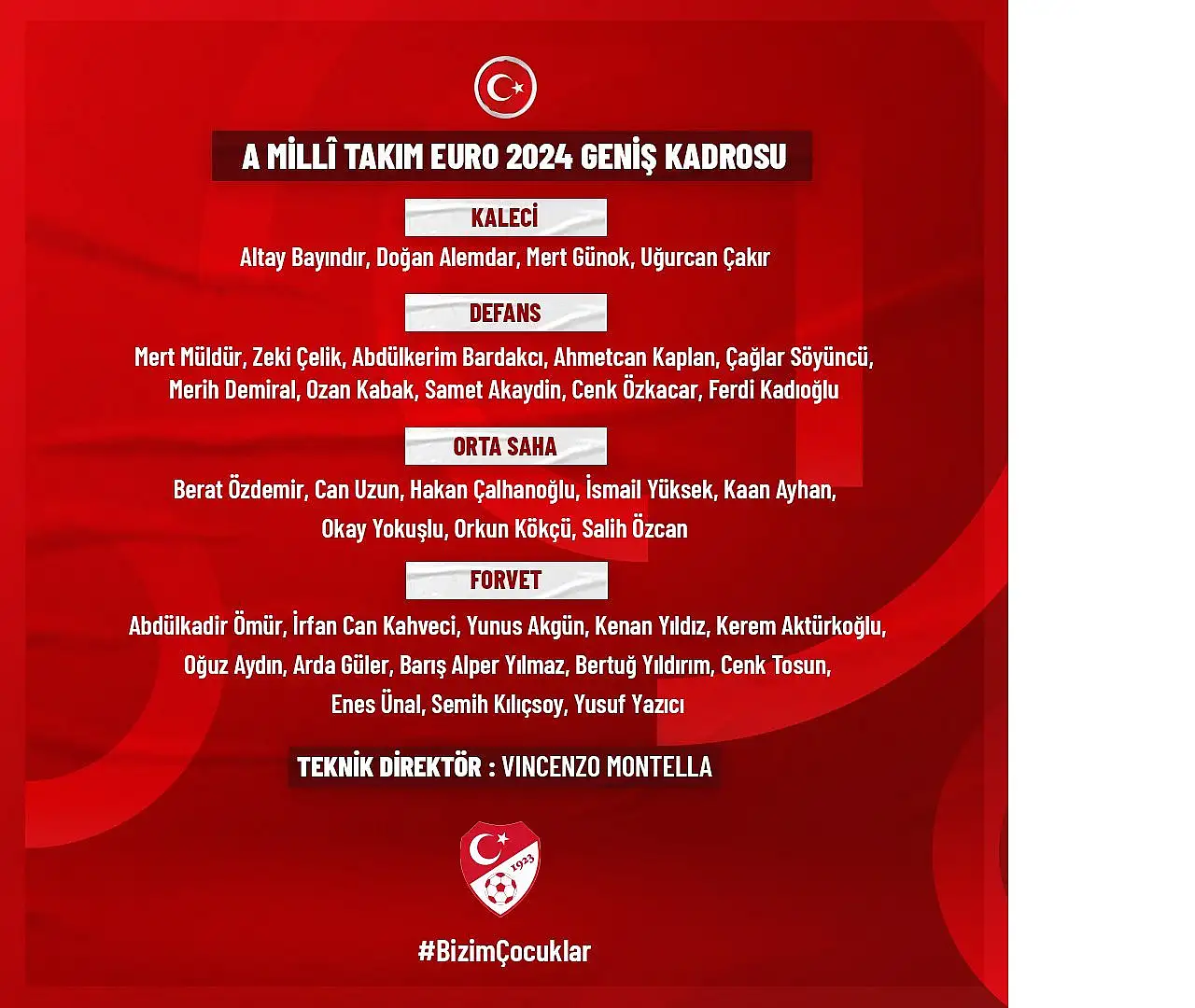TFF'nin internet sitesinde yer alan açıklamaya göre teknik direktör Vincenzo Montella'nın aday kadrosu şöyle: Ay-yıldızlılar, EURO 2024 öncesi 4 Haziran'da İtalya, 10 Haziran'da da Polonya ile deplasmanda hazırlık maçlarında karşı karşıya gelecek.26 kişil