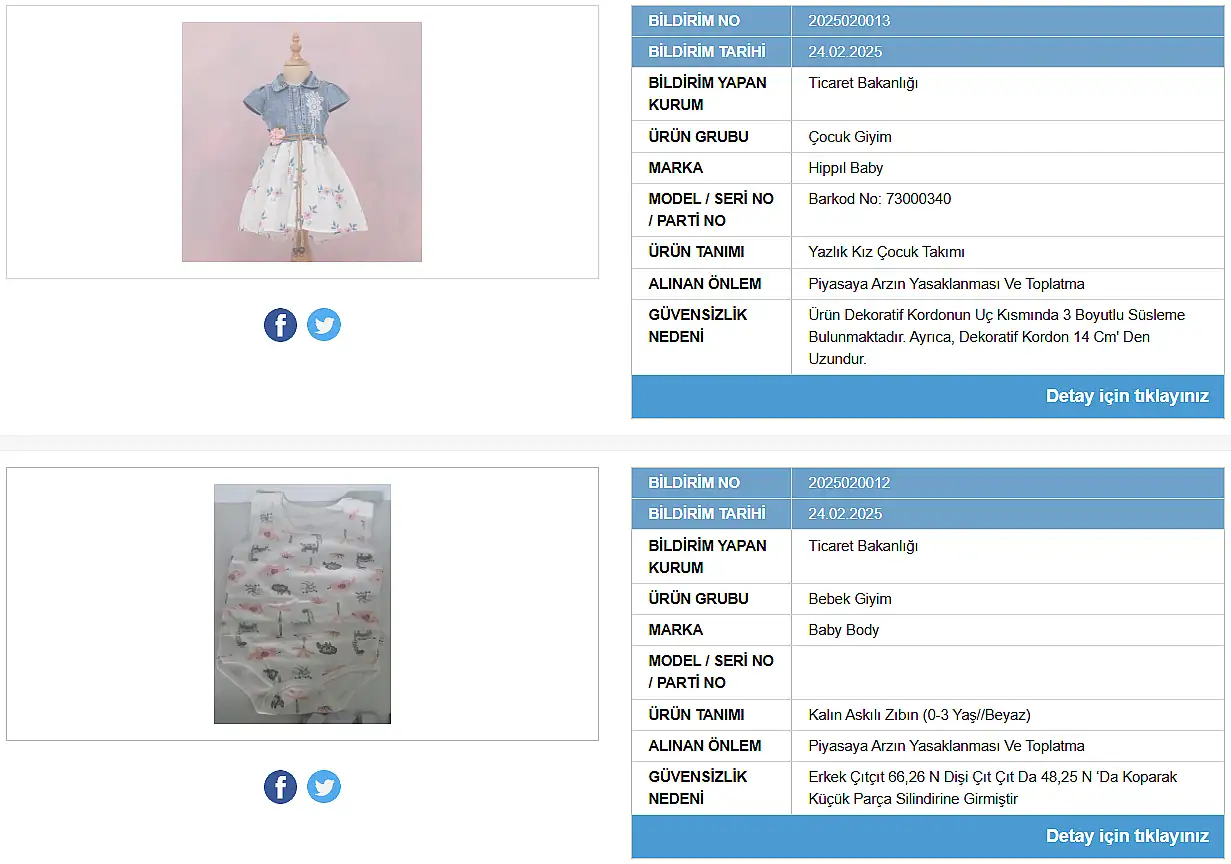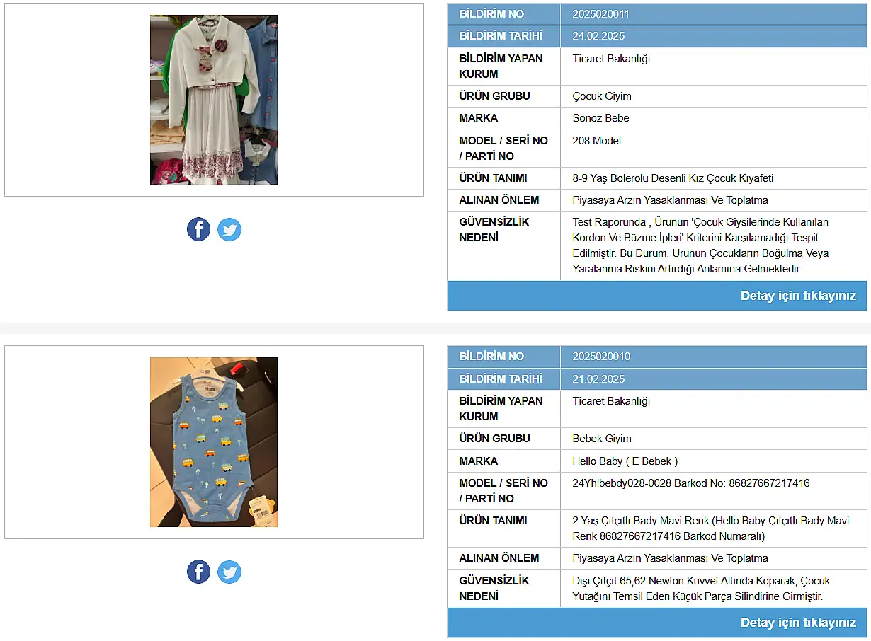 Piyasaya arzı yasaklanan ürünlerin arasında Ambalaj Kalınlığının İstenen Ölçüde Olmaması, 3 Boyutlu Süsleme, Çıtçıt Bozukluğu, Çocuk Giysilerinde Kullanılan Kordon ve Büzme İpler Kriterini Karşılamama ve Küçük Parça Bulundurma