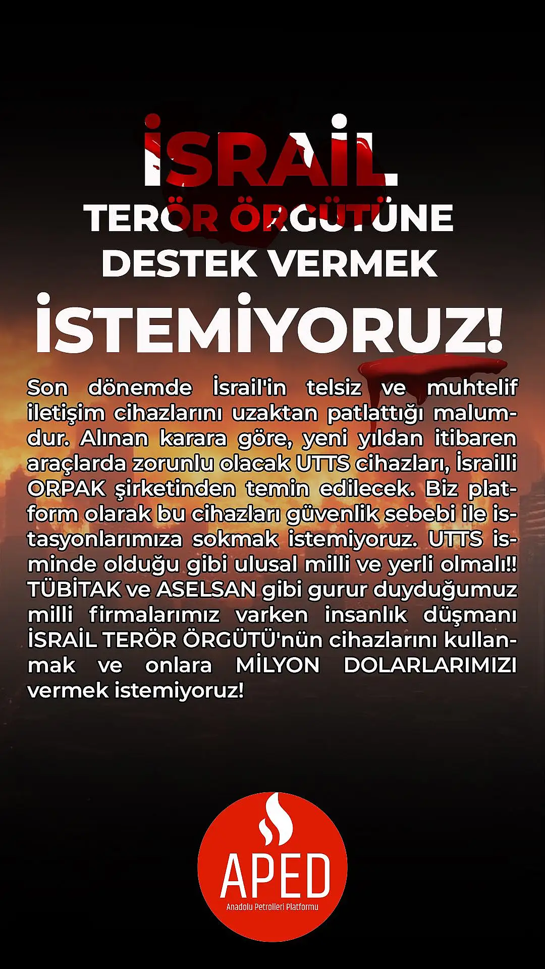 Son dönemde İsrail'in telsiz ve muhtelif İletişim cihazlarını uzaktan patlattığı malumdur. Alınan karara göre, yeni yıldan itibaren araçlarda zorunlu olacak UTTS cihazları, İsrailli ORPAK şirketinden temin edilecek. Biz platform olarak bu cihazları güvenlik sebebi ile istasyonlarımıza sokmak istemiyoruz.