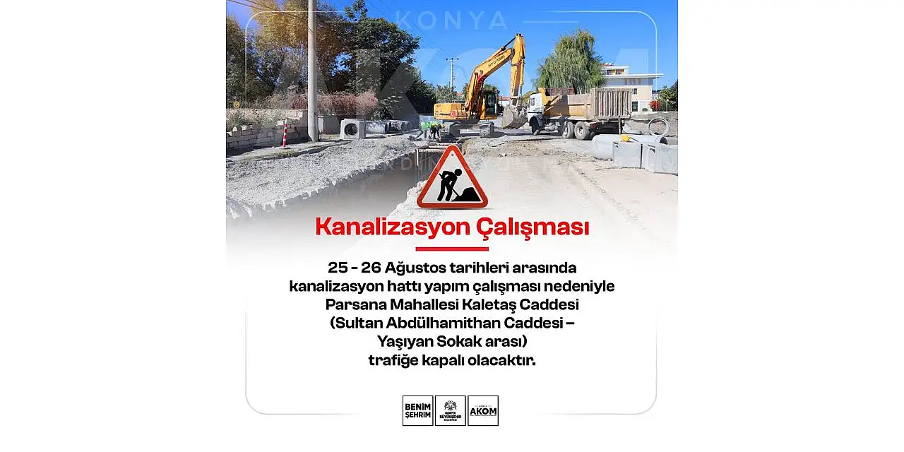 23.08.2025 – KonyaAçıklamaya göre, 25-26 Ağustos tarihleri arasında Kaletaş Caddesi’nin Sultan Abdülhamithan Caddesi ile Yaşıyan Sokak arası bölümü trafiğe kapalı olacak. Çalışmalar sırasında vatandaşların mağduriyet yaşamamaları için alternatif güzergâhları kullanmaları ve trafik yönlendirmelerine uymaları önemle rica edildi.