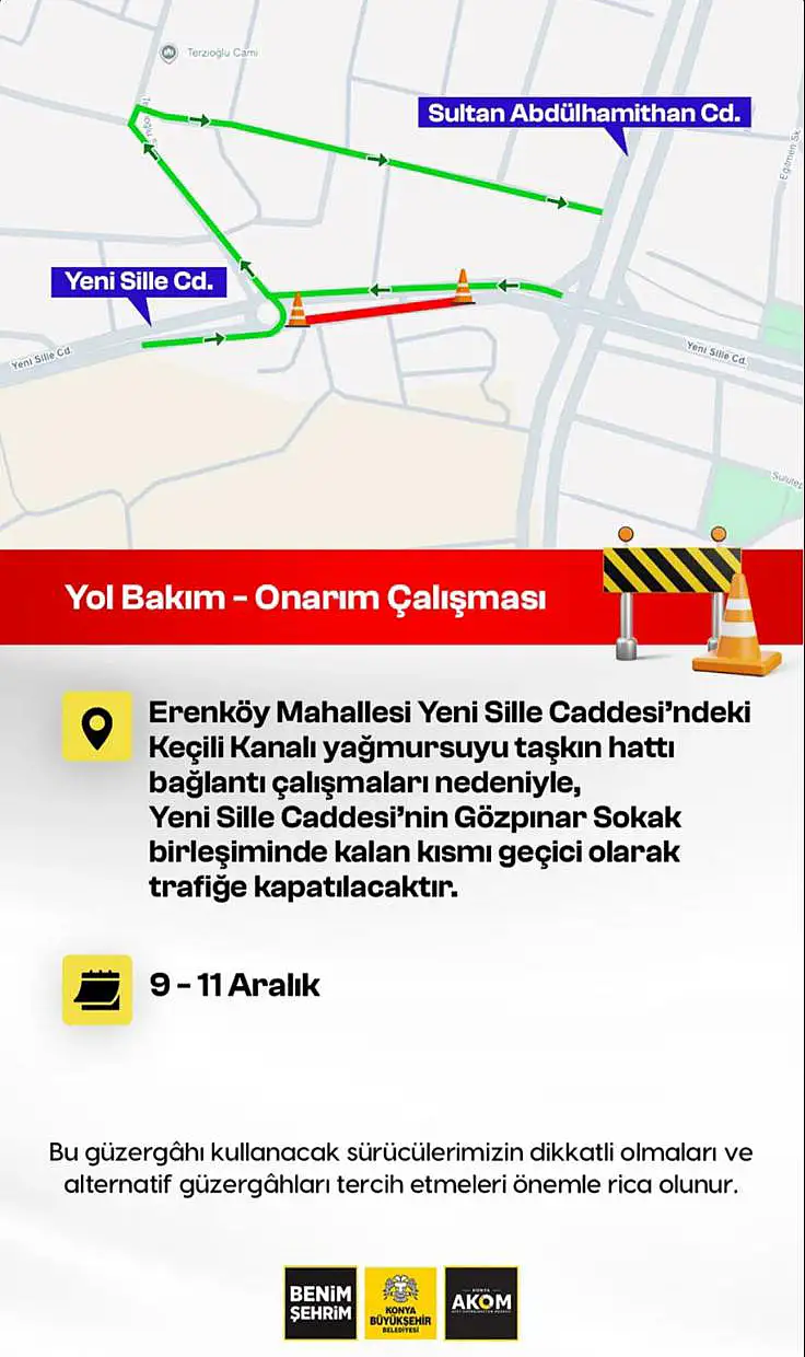 3 gün sürecek çalışmanın nedeni Keçili Kanalı yağmursuyu taşkın hattı bağlantısının yapılması olarak açıklandı. Altyapı bağlantısı süresince Erenköy Mahallesi sınırları içerisinde yer alan Yeni Sille Caddesi'nin Gözpınar Sokak ile birleşim noktası geçici süreliğine araç trafiğine kapalı olacak.