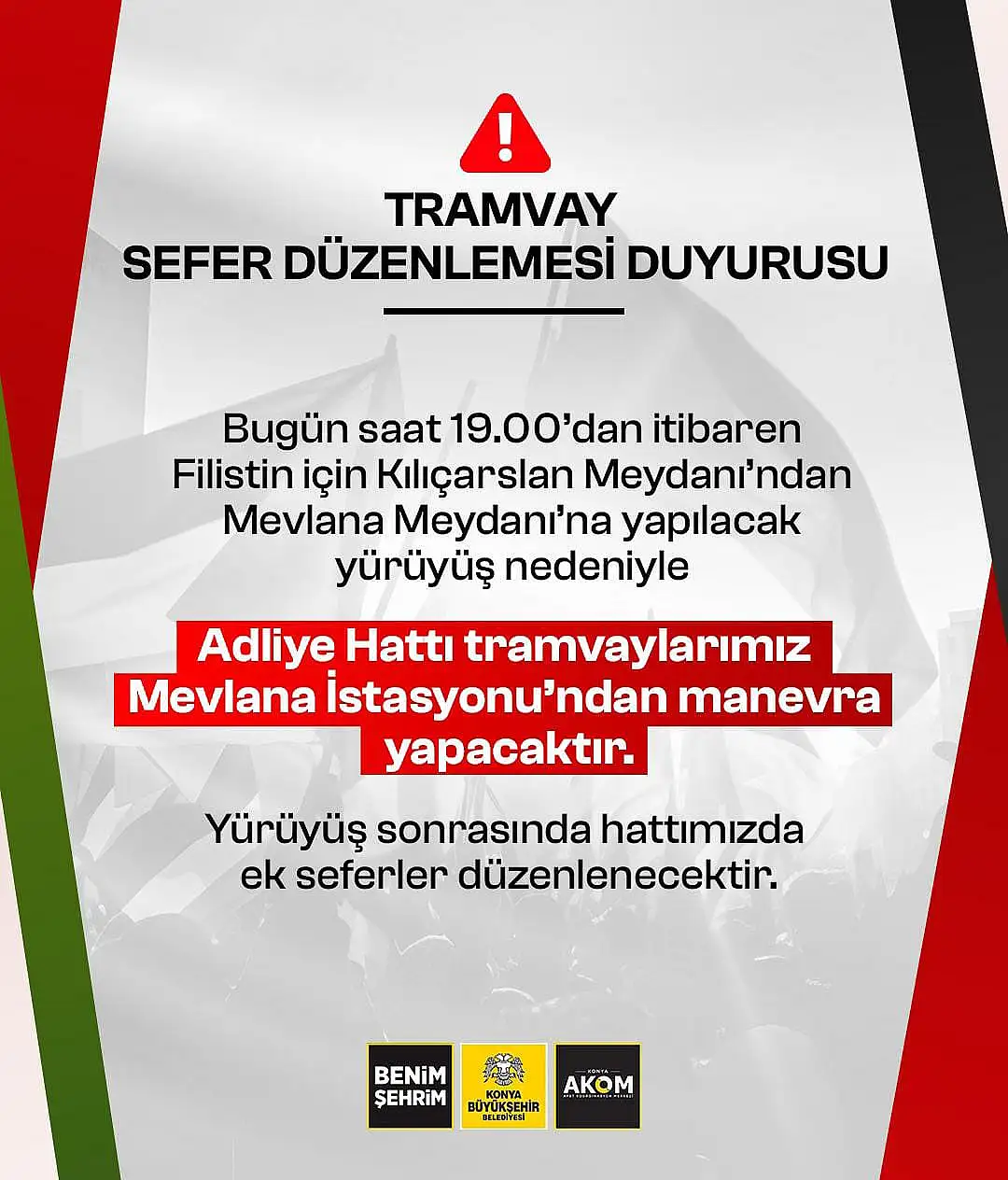 Konya Büyükşehir Belediyesi, bugün saat 19.00'dan itibaren Kılıçarslan Meydanı'ndan Mevlana Meydanı'na gerçekleştirilecek Filistin için yürüyüş nedeniyle tramvay seferlerinde düzenlemeye gidileceğini duyurdu.