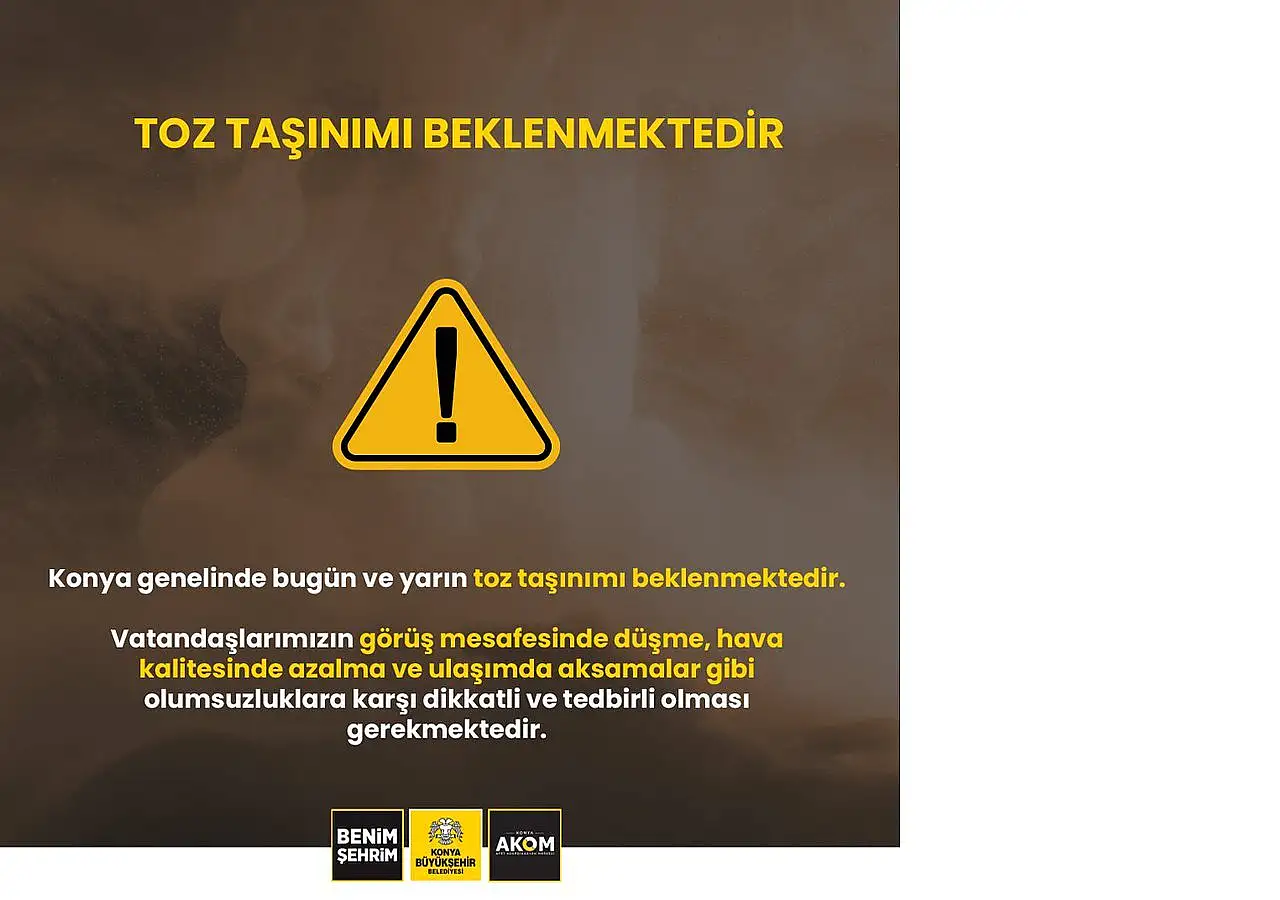 "Toz Taşınımı Bekleniyor! Konya genelinde bugün ve yarın toz taşınımı beklenmektedir. Vatandaşlarımızın görüş mesafesinde düşme, hava kalitesinde azalma ve ulaşımda aksamalar gibi olumsuzluklara karşı dikkatli ve tedbirli olması gerekmektedir."
