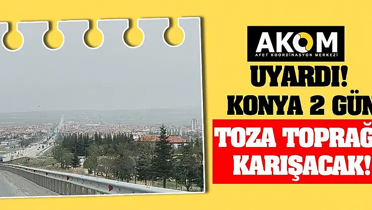 Konya Büyükşehir Belediyesi Afet Koordinasyon Merkezi (AKOM) sosyal medya hesabı üzerinden Konya'da son günlerde yaşanılan olumsuz hava şartları sonucunda oluşan aksiliklerin önüne geçmek için bugün ve yarın için Konyalıları uyardı. Konya'da oluşan şiddetli rüzgarlar sonucu bugün ve yarın toz taşınım bekleniyor. Toz taşınımı sonucu bağlantılarının kopması, hava kalitesinde bozulma ve ulaşımda aksamalar gibi olumsuzluk yaşanabilir.