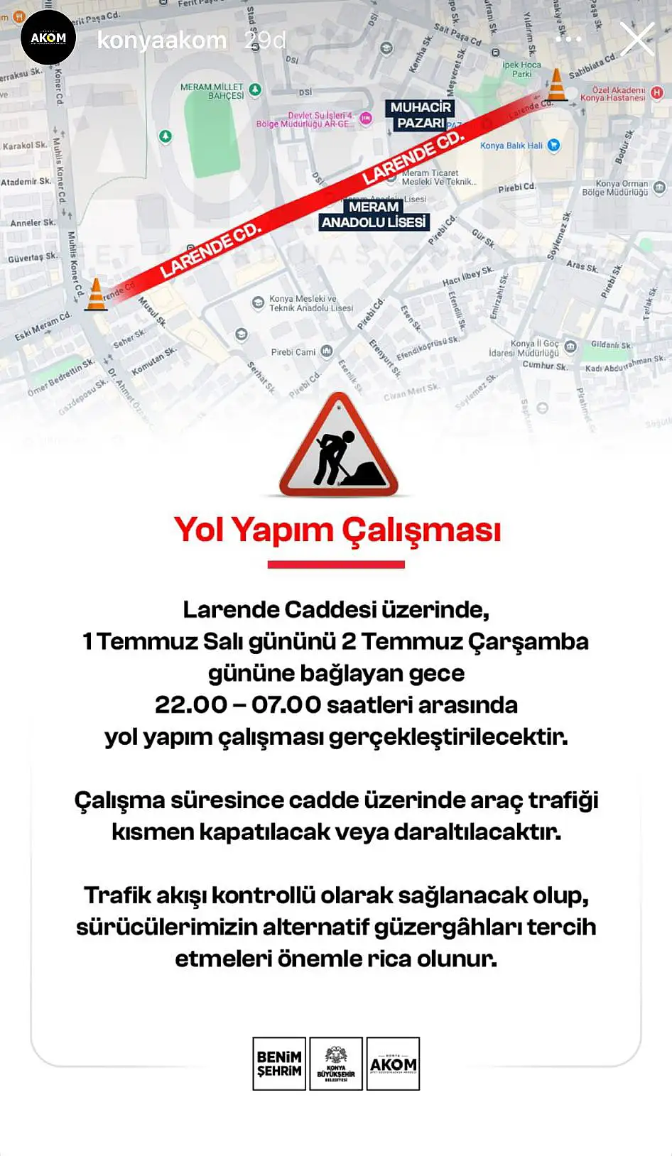 Konya Büyükşehir Belediyesi Afet ve Koordinasyon Merkezi AKOM şehrin önemli arterlerinden Larende Caddesi'nde yol yapım çalışması yapılacağını duyurdu.Çalışmalar 1 Temmuz Salı gününü 2 Temmuz Çarşamba gününe bağlayan gece saat 22.