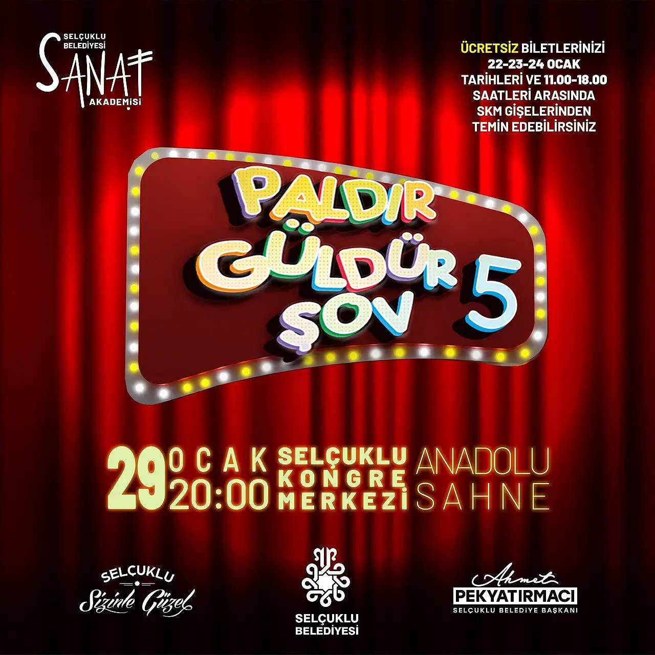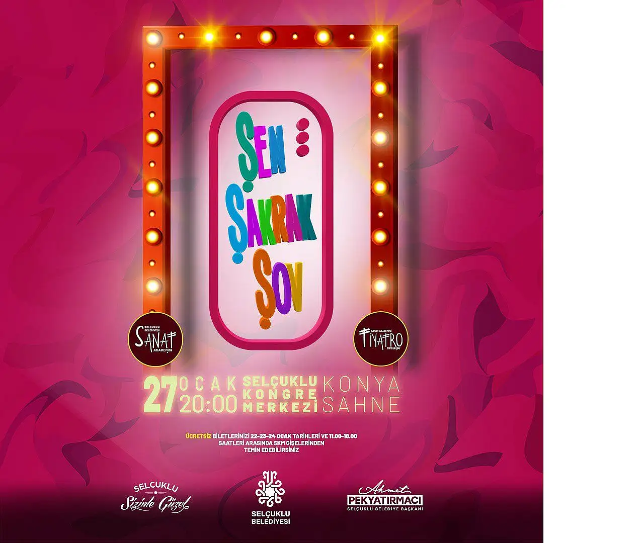 Bu kapsamda Selçuklu Belediyesi Sanat Akademisi bünyesinde eğitim alan Yetişkin Tiyatro Topluluğu tarafından ilk kez sahnelenecek olan “Şen Şakrak Şov” tiyatro oyunu 27 Ocak Pazartesi Günü saat 20.00’de Selçuklu Kongre Merkezi Konya Sahne’de seyirci ile buluşacak. Yine Akademi Genç Korosu tarafından hazırlanan “Erkin Koray Şarkıları” konseri ise 28 Ocak saat 20.00’de, Akademi Çocuk Tiyatro Topluluğu tarafından hazırlanan “Paldır Güldür Şov 5 ”isimli tiyatro oyunu ise 29 Ocak saat 20.00’de Selçuklu Kongre Merkezi Anadolu Sahne’de gerçekleştirilecek.