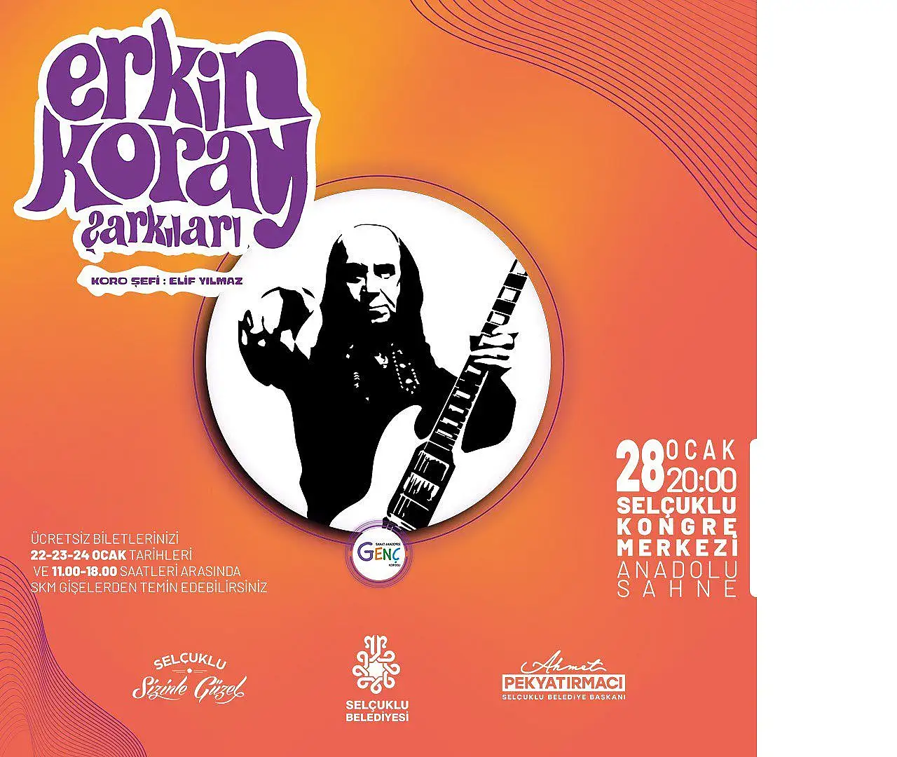 Ücretsiz olarak düzenlenecek her üç etkinliğin biletleri 23-23-24 Ocak tarihlerinde 11.00- 18.00 saatleri arasında Selçuklu Kongre Merkezi bilet gişelerinden temin edilebilecek.