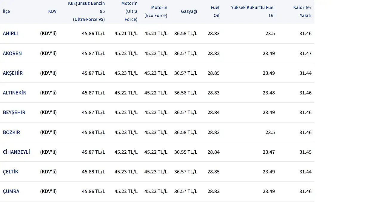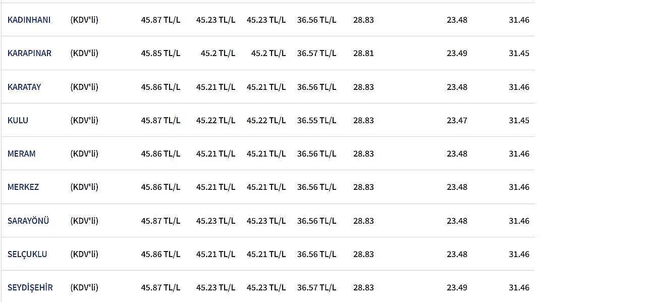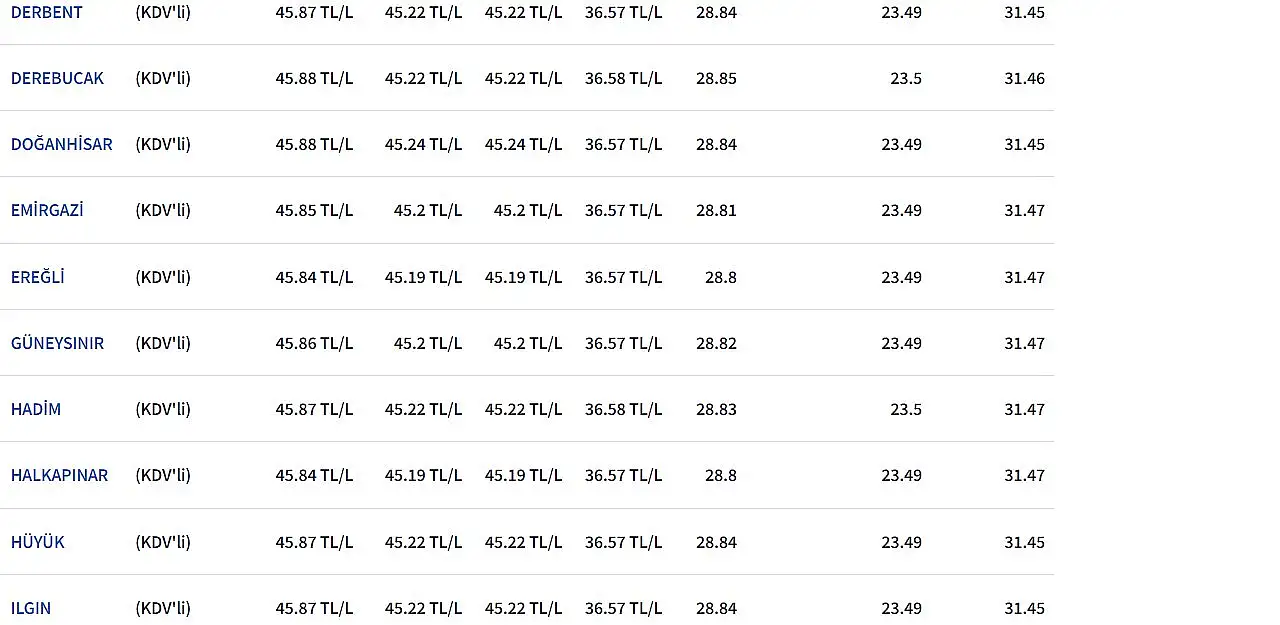 KONYA GÜNCEL AKARYAKIT FİYATLARI