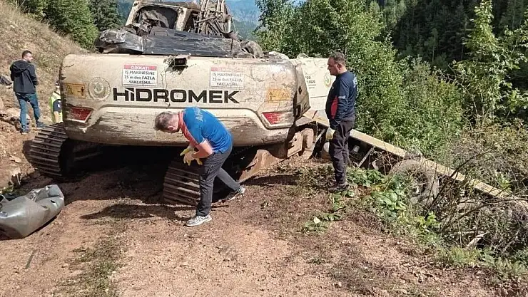 Bunun üzerine kamyon ile kasasında taşıdığı Orman İşletme Şefliğine ait ekskavatör uçuruma devrildi.