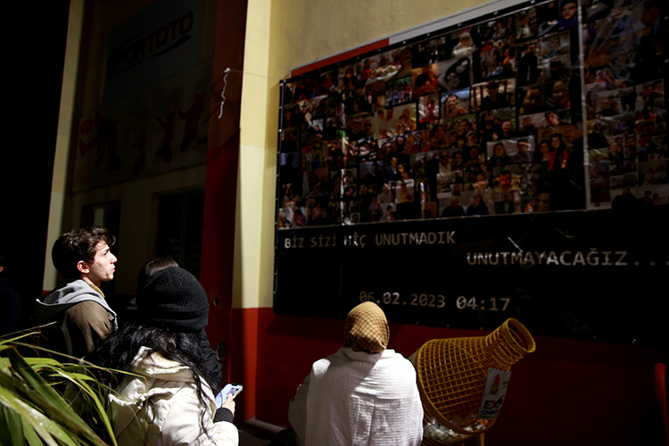 Kahramanmaraş'ta Osman Sayın Spor Salonu önünde buluşan depremzedeler, "unutmadık", "saygı ve özlemle anıyoruz" yazılı dövizleri yere sererek üzerlerine karanfil bıraktı.