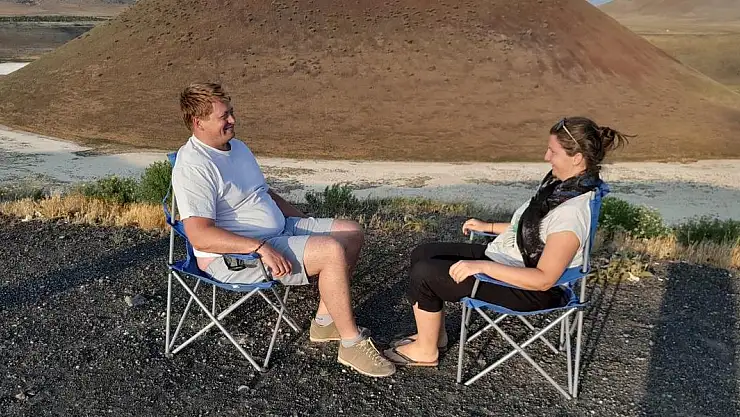 Avusturya'dan yola çıkan biyolog Judith Wenzina ve eşi Christian Höfer, karavanlarıyla çıktıkları dünya turu kapsamında Türkiye'ye geldi.Türkiye'de 16 gün kalmayı planlayan çift, Konya'nın Karapınar ilçesinde bulunan Meke Gölü'nde kamp yaparak mola verdi.