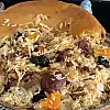 Eti ve kuru meyveleri eşit miktarda koyun. Üzerini örtecek kadar pilav ekleyin ve lavaşı kapatın.