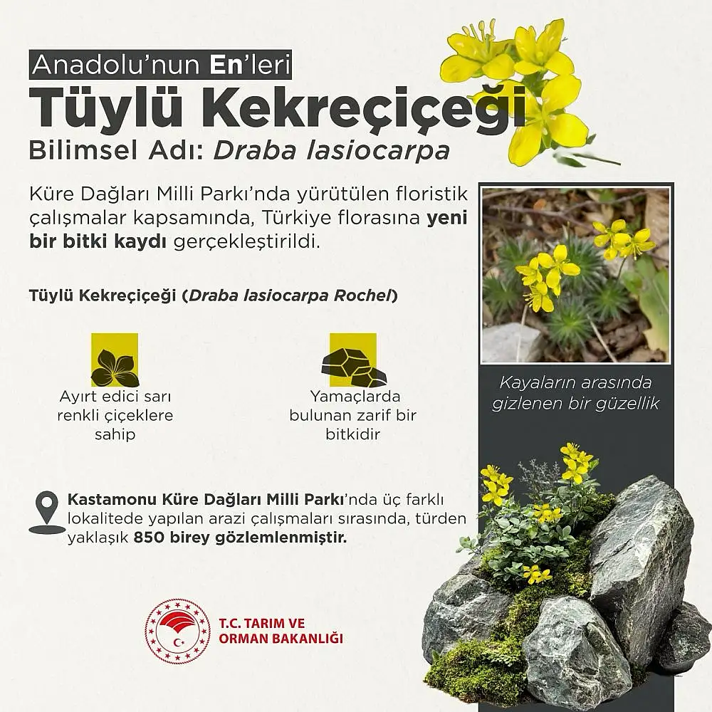 Bakan Yumaklı, NSosyal hesabından yaptığı açıklamada, 'Anadolu'nun En'leri arasına yeni bir keşif: Tüylü Kekreçiçeği.Küre Dağları Milli Parkı'nda kayalık yamaçlarda gözlemlenen bu zarif bitki floramıza kaydedildi.