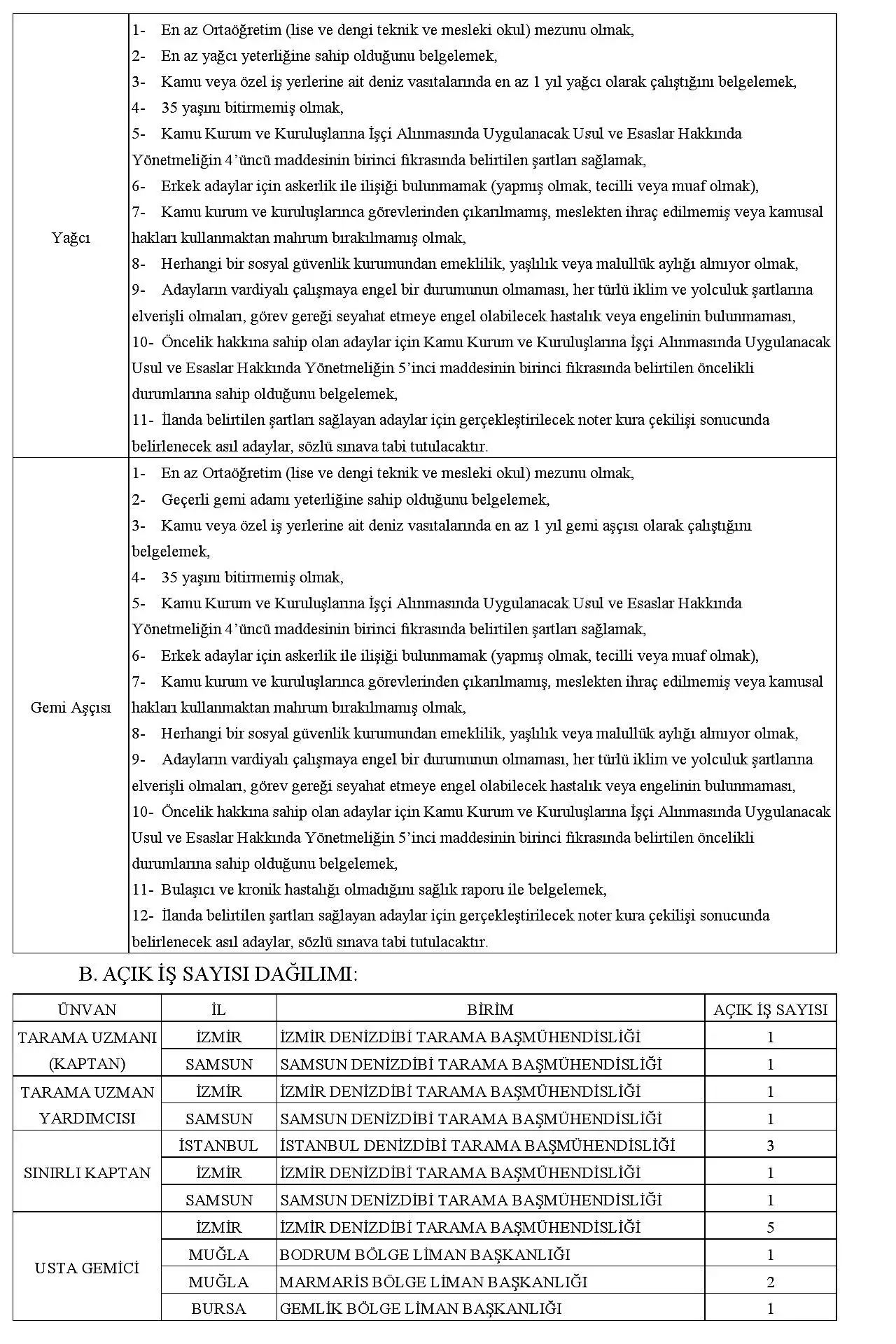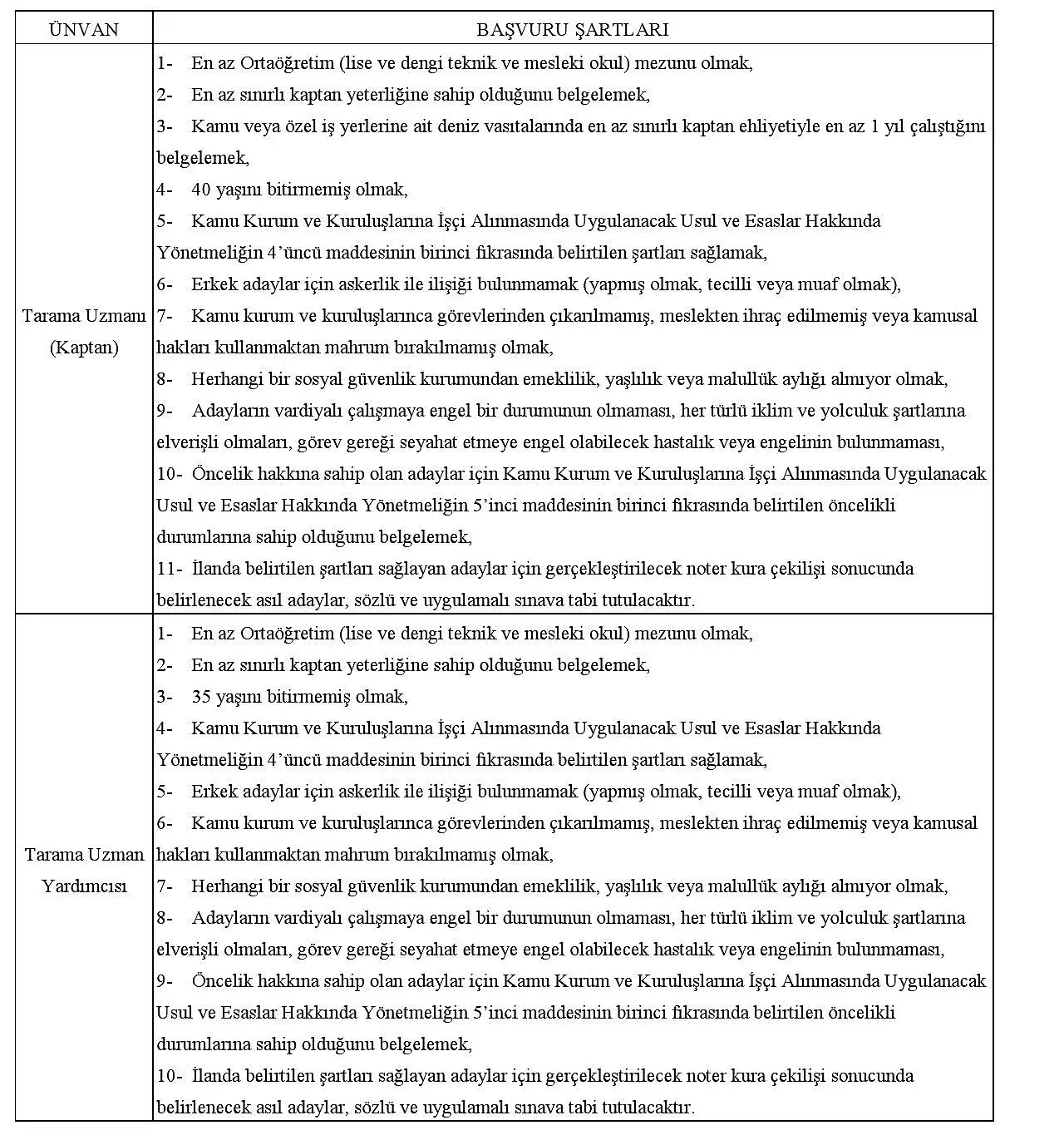 1- Adayların, başvurunun son günü itibarıyla aşağıda yer alan tabloda başvuruda bulunacağı ünvan ile ilgili başvuru şartlarını taşıması gerekmekte olup denizcilikle ilgili yeterlik (belge) ile hizmet şartı başta olmak üzere diğer belirtilen şartları sağlamayanların başvuruları değerlendirilmeye alınmayacak ve yapılacak olan noter kura çekilişine dahil edilmeyecek.