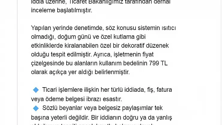 Ticaret Bakanlığı'nın sosyal medya hesabından Iğdır'da bir mekandaki masalarda ısıtma sisteminin bulunduğu ve bunun açılması için 2 bin TL talep edildiği iddialarına açıklama paylaşıldı. Bakanlık tarafından yapılan açıklama, "İddia üzerine, Ticaret Bakanlığımız tarafından derhal inceleme başlatılmıştır. Yapılan yerinde denetimde, söz konusu sistemin ısıtıcı olmadığı, doğum günü ve özel kutlama gibi etkinliklerde kiralanabilen özel bir dekoratif düzenek olduğu tespit edilmiştir. Ayrıca, işletmenin fiyat çizelgesinde bu alanların kullanım bedelinin 799 TL olarak açıkça yer aldığı belirlenmiştir" ifadelerine yer verildi.