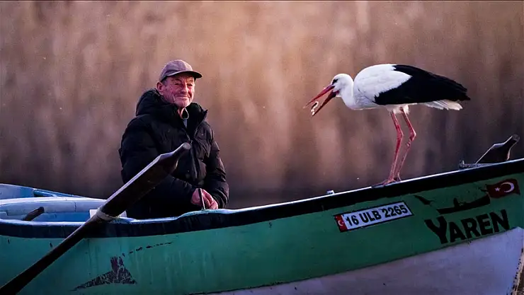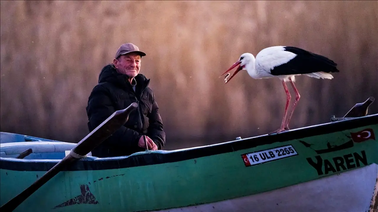 Yaren leyleğin, göl manzaralı yuvasının bulunduğu mahallede balıkçı Yılmaz'ın kayığındaki "geleneksel" pozu, doğa ve yaban hayatı fotoğrafçısı Alper Tüydeş tarafından kayda alındı.