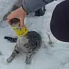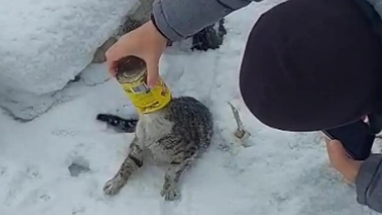 Eruzurum'da yiyecek ararken başı konserve kutusuna sıkışan kediyi, yoldan geçen 2 kardeş kurtardı