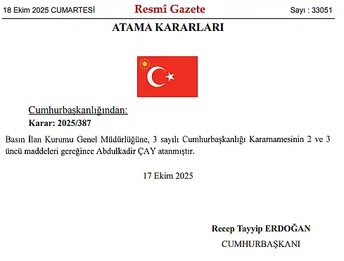 Resmî Gazete’de yayımlanan 2025/387 sayılı Cumhurbaşkanlığı Kararı ile, Basın İlan Kurumu Genel Müdürlüğü görevine Abdulkadir Çay getirildi.