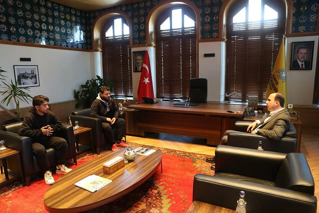 Konya Büyükşehir Belediye Başkanı Uğur İbrahim Altay, Selçuk Mahallesi’nde 4 katlı bina çökmeden önce durumu fark ederek tüm dairelerin kapılarını çalan ve insanların dışarı çıkmasını sağlayan Ali El Hüseyin (20) ile abisi Muhammed El Hüseyin’i ağırladı.
