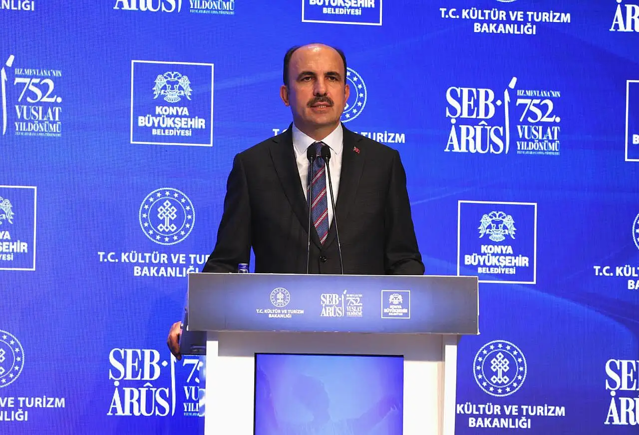 Programda konuşan Kültür ve Turizm Bakanı Mehmet Nuri Ersoy ise, Kültür ve Turizm Bakanlığı olarak, Konya Büyükşehir Belediyesi ile birlikte bu yıl da Hazret-i Mevlânâ’yı 11 gün sürecek meşkler, paneller, sergiler, söyleşiler, atölye çalışmaları, konserler, Sema Mukabelesi ve farklı etkinliklerle anacaklarını söyledi. Bakan Ersoy, "Mevlânâ’nın yolundan gidenlerin bir hayat anlayışına dönüştürdüğü “Mevlevîlik” kültürünün bizlere armağan ettiği değerler arasında; kendine has âdâb ve erkânı, özel mûsikîsi ve edebî külliyâtı ile “Semâ” geleneği, hiç şüphesiz benzersiz bir yere sahiptir. Türk kültürünü oluşturan ve besleyen birçok unsur gibi, bu geleneğin ve mirasın korunması da Bakanlığımızın başlıca sorumluluğu arasındadır. Bu çerçevede bakanlık olarak Mevlevî Semâ Törenleri’nin dünya ölçeğinde tanınması ve bu kültürün evrensel düzeyde bilinmesi için birçok çalışma gerçekleştirmekteyiz. Nitekim Dışişleri Bakanlığımız ile Kültür ve Turizm Bakanlığımızın yoğun girişimleri neticesinde, Mevlevî Semâ Mukabelesi UNESCO nezdinde “İnsanlığın Somut Olmayan Kültürel Mirasının Temsilî Listesi”ne 2008 yılında “ülkemiz adına” kaydettirilmiştir. Biliyorsunuz Konya’da düzenlenen bu etkinlik dünya kamuoyu tarafından da yakından takip ediliyor. Mevlana’nın felsefesi, öğretileri yüzbinlerce insanı her yıl Konya’ya çekiyor. Bu ilgi Şeb-i Arus zamanında daha da artıyor. Bizler de bu atmosferi daha iyi tanıtabilmek adına Türkiye Turizm Tanıtım ve Geliştirme Ajansımızı da harekete geçirdik. TGA ile 200’e yakın ülkede tanıtım faaliyetleri yürütüyoruz ve GoTürkiye platformu ile milyonlarca takipçiye ulaşabiliyoruz. Hazırlanan özel bir tanıtım filmi ile etkinliklerimizi tüm dünyaya duyuracağız. Bu yıla özel bir başka etkinliğimizi ise Türkiye Yazma Eserler Kurumu Başkanlığımız aracılığıyla gerçekleştireceğiz. Alanındaki ilk ve en kapsamlı etkinlik olan “Müzehhep Mesnevîler Sergisi” ile yetmiş müzehhep Mesnevî nüshası bir araya getirdik ve Aralık ayı içinde Rami Kütüphanemizde sergilemeye başlayacağız. Bu sergi ile ziyaretçilerimizin Mesnevi’nin 7 yüzyılı aşan yolculuğuna hattalar ve müzehhipler tarafından ortaya konan nüshalarla tanıklık etmesini amaçlıyoruz. Tüm insanlığı refah, huzur ve saadete ulaştırmaya vesile olacak bu güzide değerleri yeniden hatırlamak üzere; Vuslat’ın 752. Yılı’nın hayır, güzellik ve mutluluklara vesile olmasını temenni ediyorum. “Gönlün huzuru, gönül sahiplerinin huzurundadır.” hikmetinin örgülediği Huzur Vakti temalı etkinliklerimizde buluşmaya, iyilik ve güzellikleri paylaşmaya bütün Mevlâna dostlarını davet ediyor, sizleri sevgiyle ve muhabbetle selamlıyorum" diye konuştu.