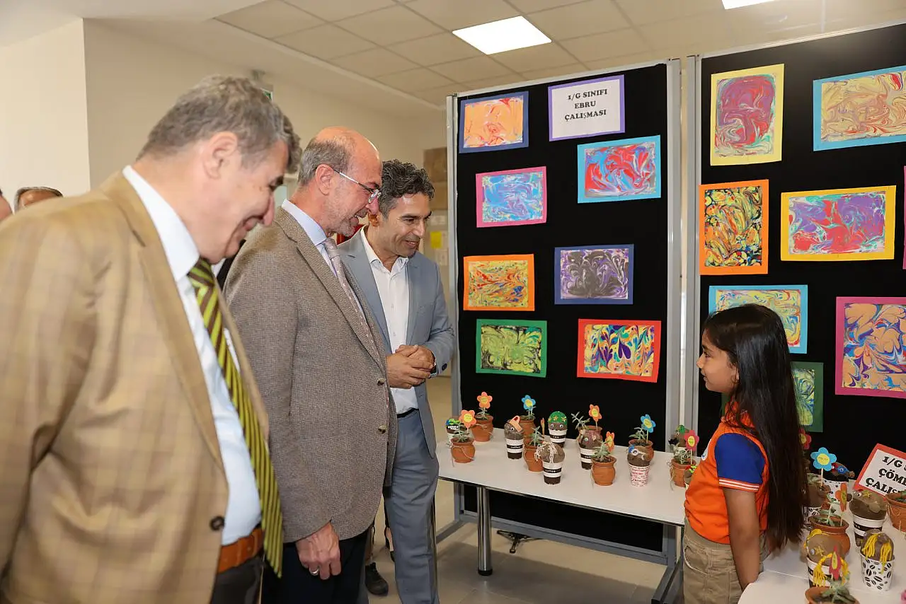 Kaymakam Tortop ve Başkan Pekyatırmacı, serginin açılışını yaptıktan sonra öğrencilerin eserlerinden oluşan yıl sonu sergisini gezerek öğrencilerle sohbet etti.