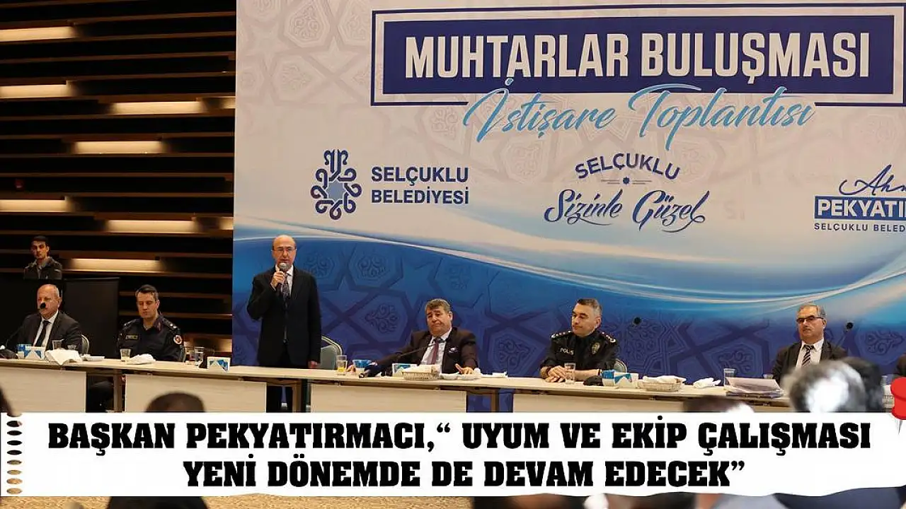 Selçuklu Belediye Başkanı Ahmet Pekyatırmacı seçim sonrasında seçilerek göreve gelen muhtarlarla bir araya geldi. Selçuklu Kongre Merkezi'nde gerçekleşen toplantıya Selçuklu Belediye Başkanı Ahmet Pekyatırmacı'nın yanı sıra Selçuklu Kaymakamı Eflatun Can Tortop, Selçuklu İlçe Emniyet Müdürü Ersan Aydın, Selçuklu İlçe Jandarma Komutanı Jandarma Üsteğmen Muhammed Kavak, mahalle muhtarları, belediye başkan yardımcıları katıldı.