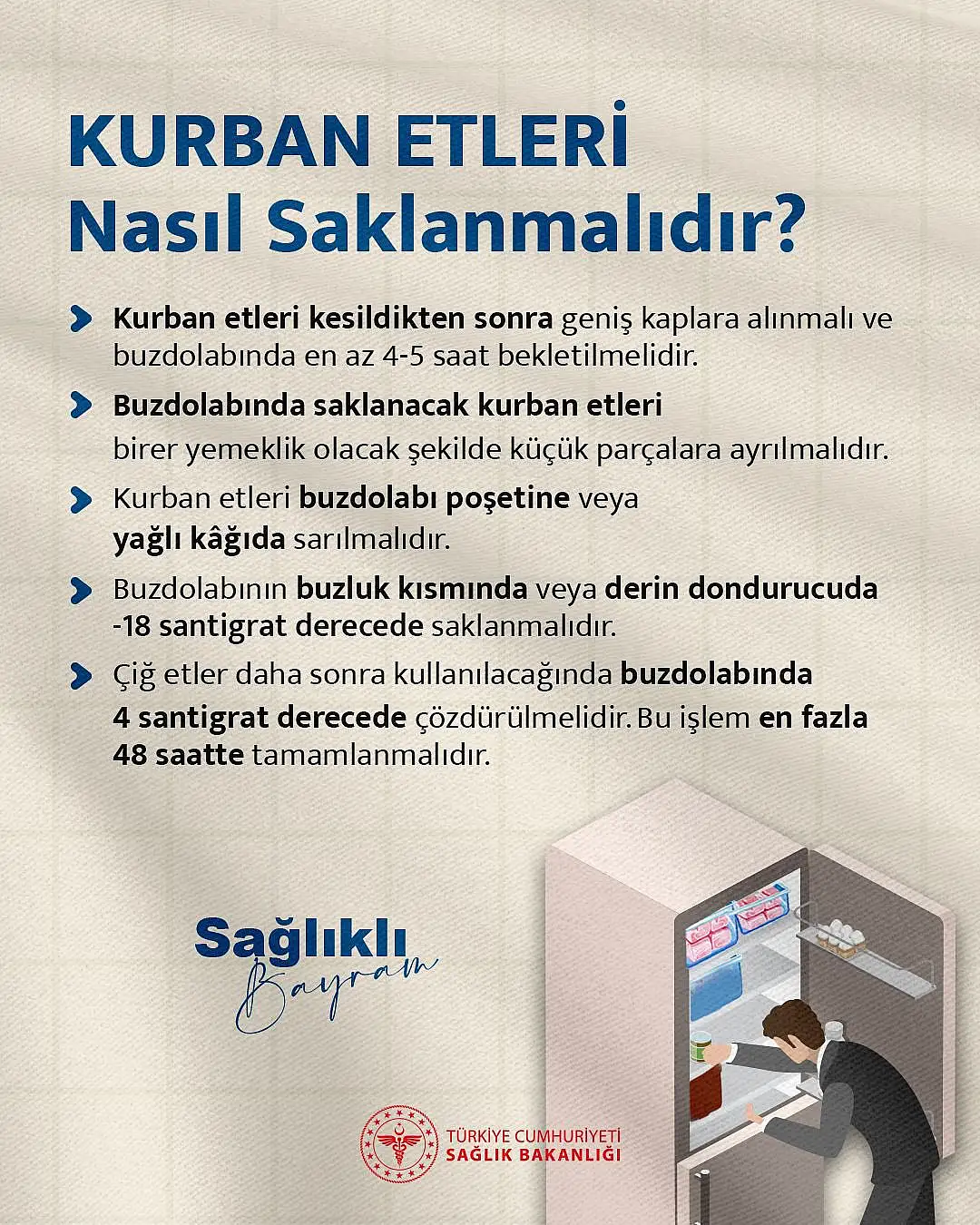 Bakanlık, kurban etlerinin doğru ve hijyenik şekilde saklanmasının halk sağlığı açısından büyük önem taşıdığını belirtti.Bakanlık tarafından hazırlanan bilgilendirme afişinde, kurban etlerinin güvenli bir şekilde muhafaza edilmesi için dikkat edilmesi ger