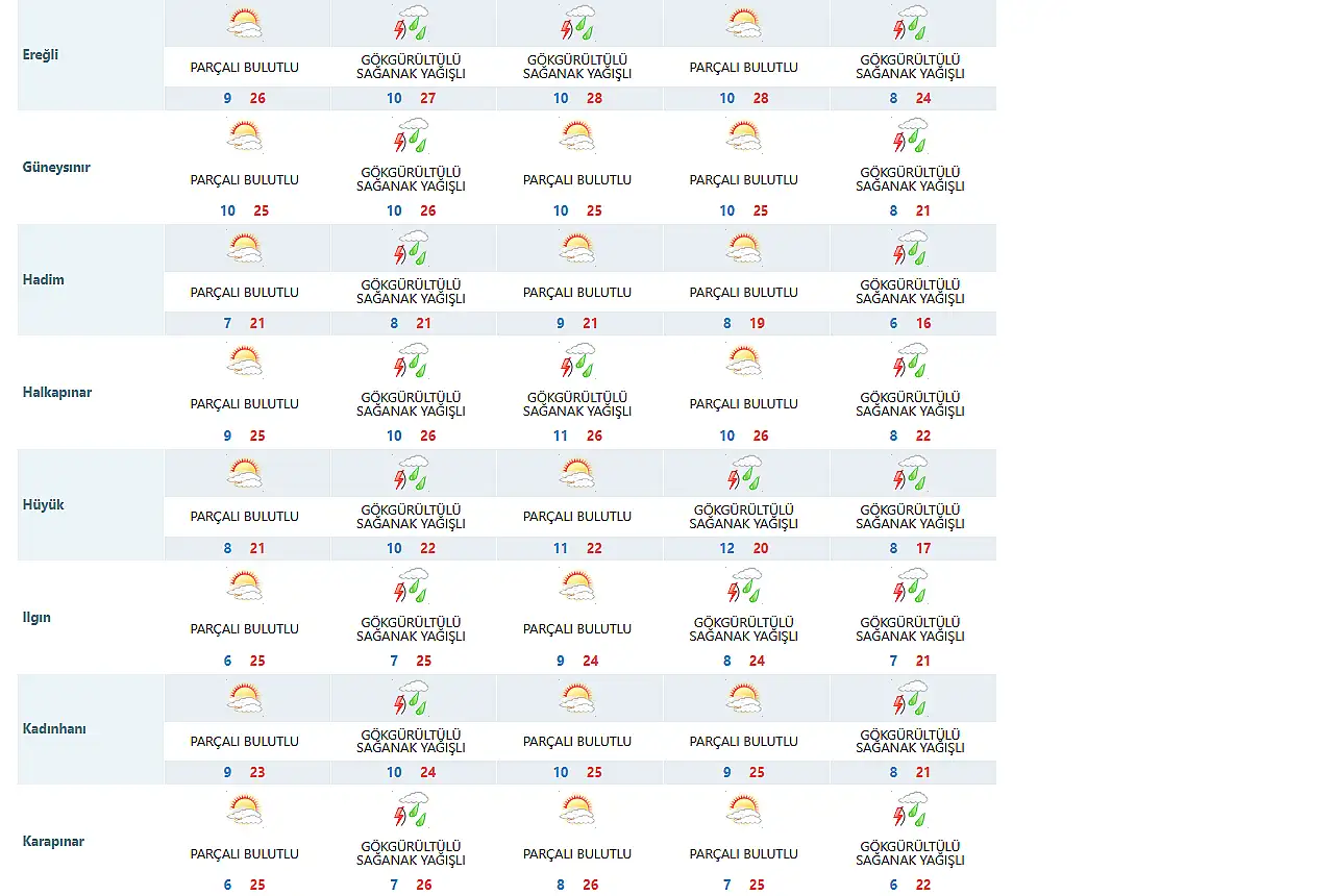 Meteoroloji 8. Bölge Müdürlüğü, tarafından yapılan son tahmine göre Konya merkezde ve ilçelerinde en düşük ve en yüksek sıcaklık dereceleri ise şöyle olacak: