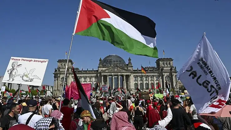 Almanya'nın İsrail'in Gazze'de işlediği soykırıma desteğinin son bulması talebiyle ve Filistin ile dayanışma göstermek için on binlerce kişi, Federal Meclis Binası (Reichtstag) önünde toplandı.Ardından kent merkezinde yürüyüş düzenleyen göstericiler, Alma