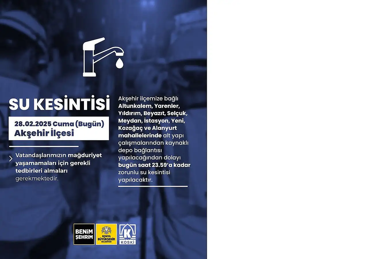 Konya'da 28 Şubat Cuma günü su kesintisi yaşanacak.KOSKİ Genel Müdürlüğü sosyal medya hesabından yaptığı paylaşımla Konya'nın Akşehir ilçesinde bulunan 10 mahallesinde su kesintisi olduğunu duyurdu.