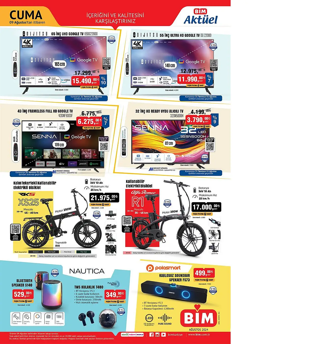 BİM Aktüel kataloğunda bu hafta elektrikli bisikletten televizyona, kulaklıktan bluetooth speakera, mutfak gereçlerinden giyim ürünlerine bir çok ürün satışa sunulacak.
