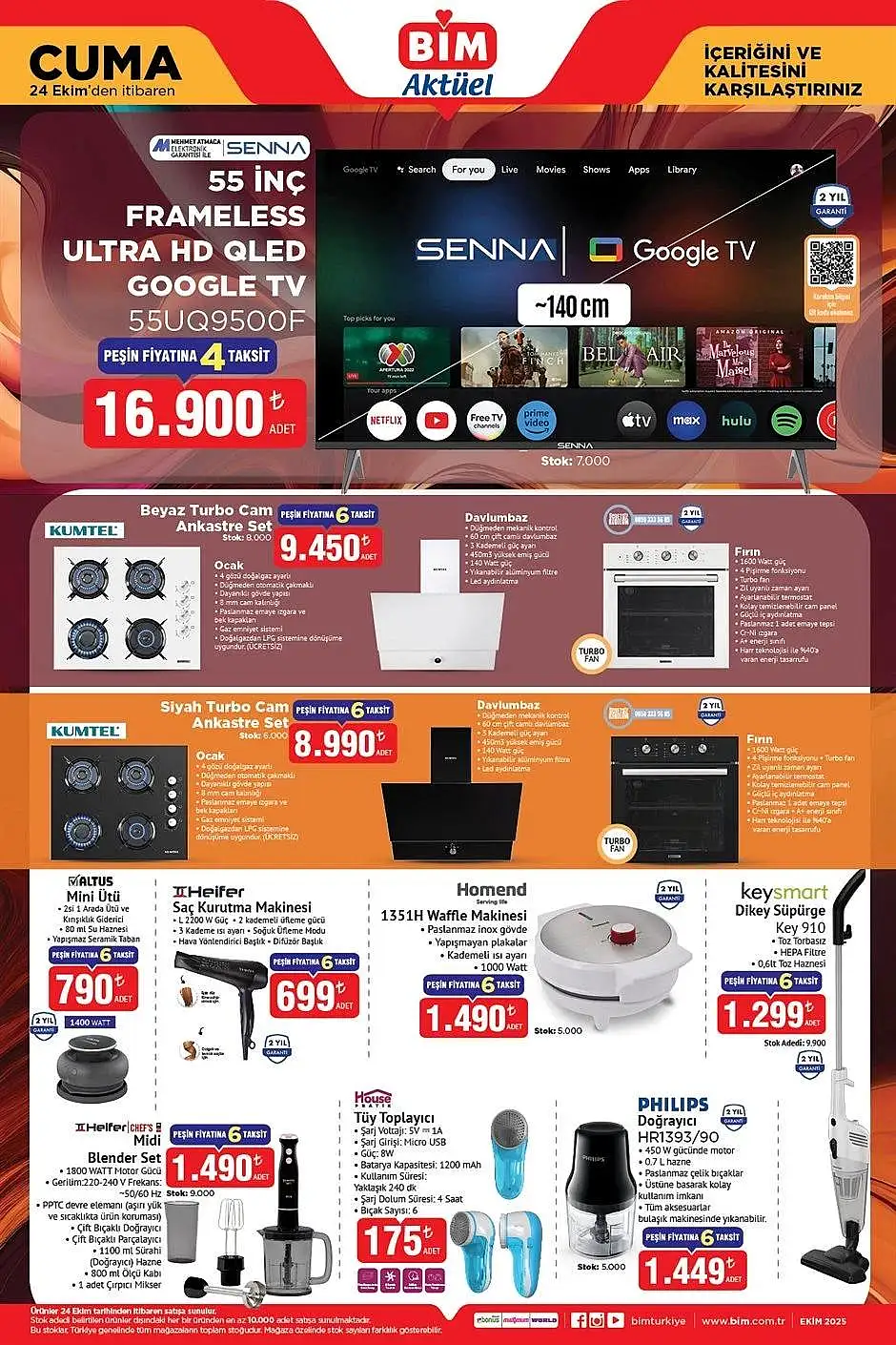Bim katalog bu hafta da avantajlı indirimli ürünlerle raflarda ve bim online alışveriş sitesi bim.com.tr'den satışa sunulacak. Bim yeni hafta ile elektronik ev aletlerinden, kişisel bakım ürünlerine, mutfak ürünlerinden ev tekstiline pek çok şey alışveriş severlerin beğenisine sunulacak. Bim aktüel 24 Ekim 2025 kataloğunda neler var? İşte detaylar...