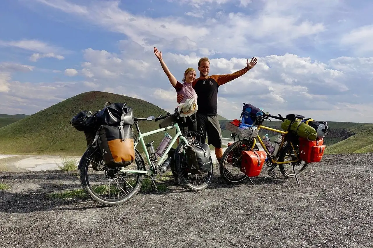 İsviçre'de yaşayan Melanie Senn ve Jan Schneider çifti 3 ay önce bisikletleri ile dünya turu için yola çıktı.Tura başladıkları günden itibaren 4 bin 100 kilometre pedal çevirdiklerini ve günde en az 5 saat bisiklet kullandıklarını anlatan çift, Meke Gölü'