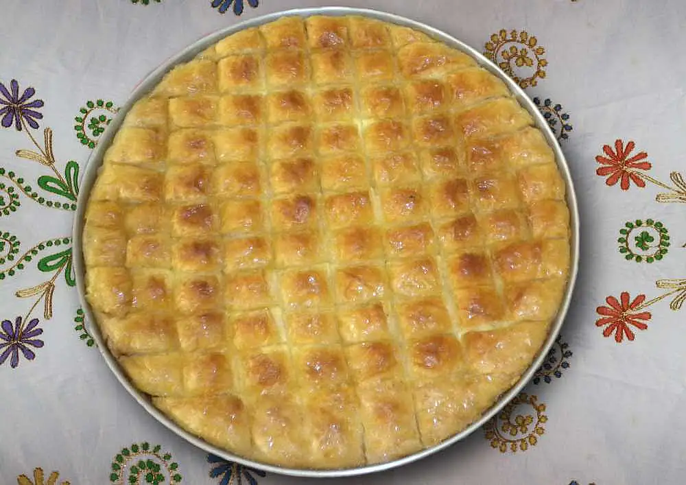 Peynir Baklavası, fırınlama tekniğiyle pişirilerek börek görüntüsüyle ün kazanmış şerbetli bir tatlı olarak sunuluyor.