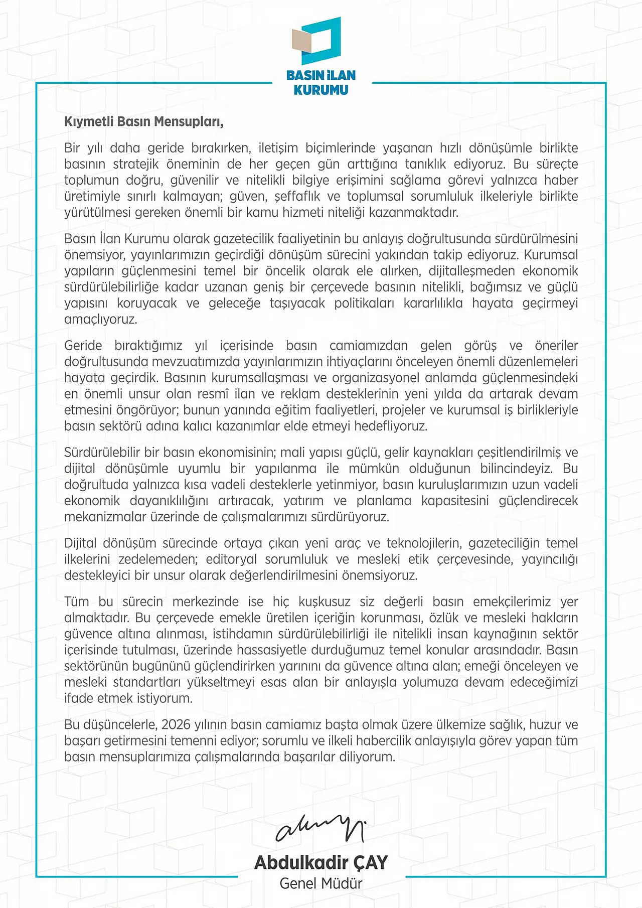 Basın İlan Kurumu Genel Müdürü Abdulkadir Çay, yeni yıla girerken basın camiasına yönelik değerlendirmelerde bulundu. İletişim biçimlerinde yaşanan hızlı dönüşümün, basının stratejik önemini her geçen gün artırdığını vurgulayan Çay, doğru, güvenilir ve nitelikli bilgiye erişimin artık yalnızca haber üretimiyle sınırlı olmadığını; güven, şeffaflık ve toplumsal sorumluluk ilkeleriyle birlikte güçlü bir kamu hizmeti niteliği taşıdığını ifade etti.