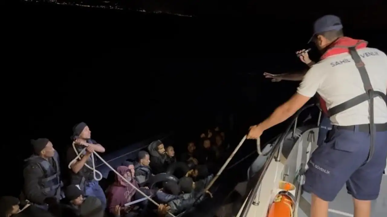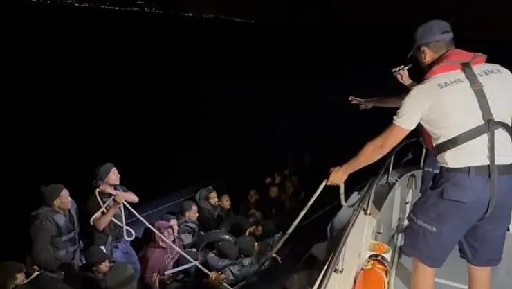 İzmir'in Çeşme ilçesi açıklarında, motor arızası nedeniyle denizde sürüklenen lastik bottaki 42 düzensiz göçmen Sahil Güvenlik ekiplerince kurtarıldı.