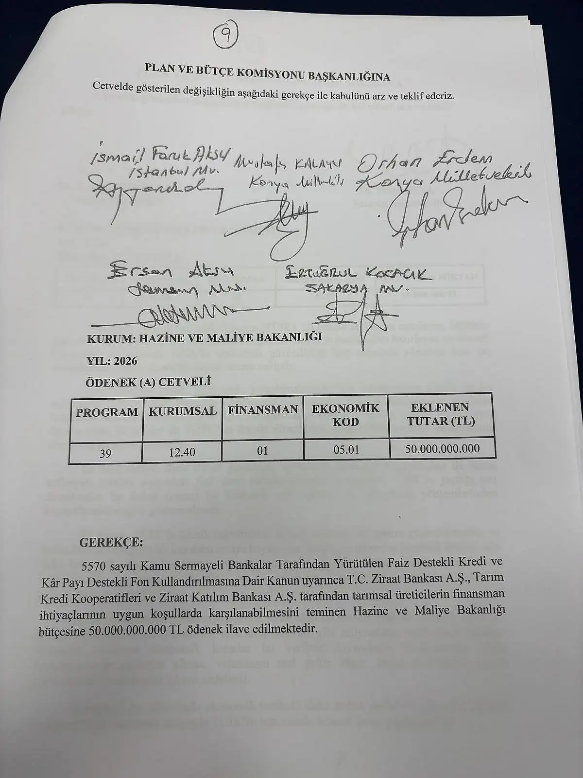 Teklifin gerekçesinde; “5570 sayılı Kamu Sermayeli Bankalar Tarafından Yürütülen Faiz Destekli Kredi ve Kâr Payı Destekli Fon Kullandırılmasına Dair Kanun uyarınca T.C. Ziraat Bankası A.Ş., Tarım Kredi Kooperatifleri ve Ziraat Katılım Bankası A.Ş. tarafından tarımsal üreticilerin finansman ihtiyaçlarına uygun koşullarda karşılanabilmesini teminen Hazine ve Maliye Bakanlığı bütçesine 50 milyar TL ödenek ilave edilmektedir” denildi.