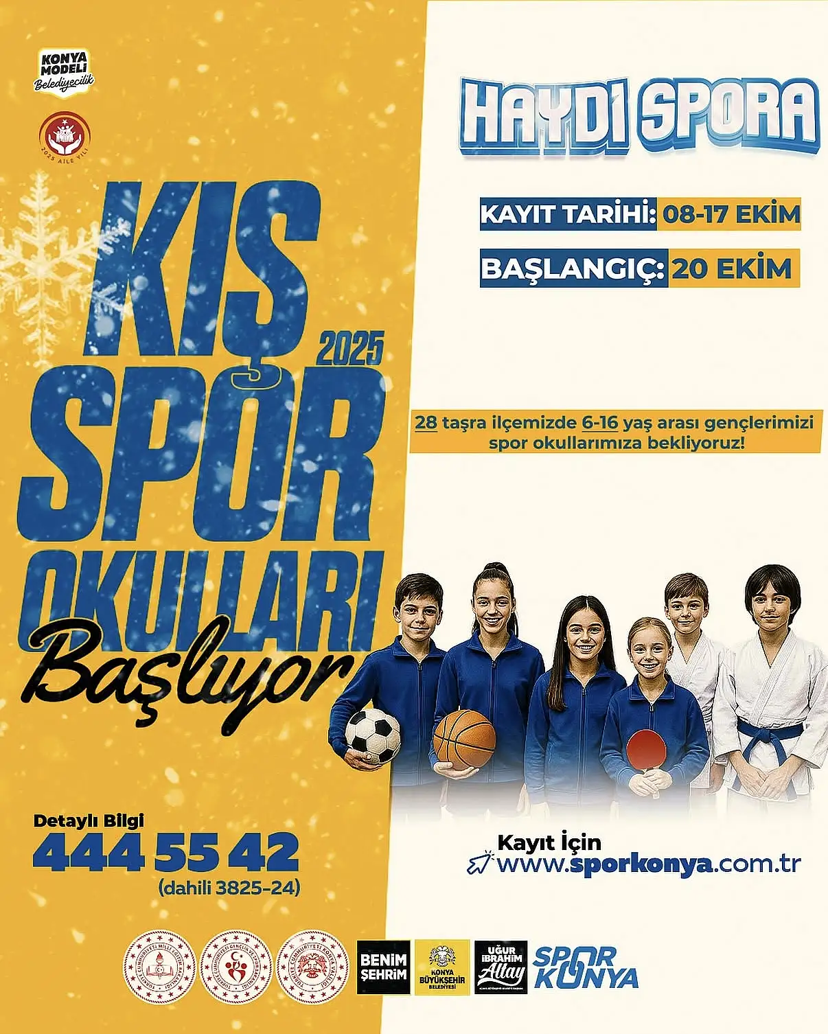 20 Ekim 2025 tarihinde başlayacak spor okulları için kayıtlar 08 - 17 Ekim tarihleri arasında yapılacak. Kayıt yaptırmak isteyenler ayrıntılı bilgi için www.sporkonya.com.tr adresinden ya da 444 55 42 (dahili 3825-24) nolu hattan bilgi alabilecek.