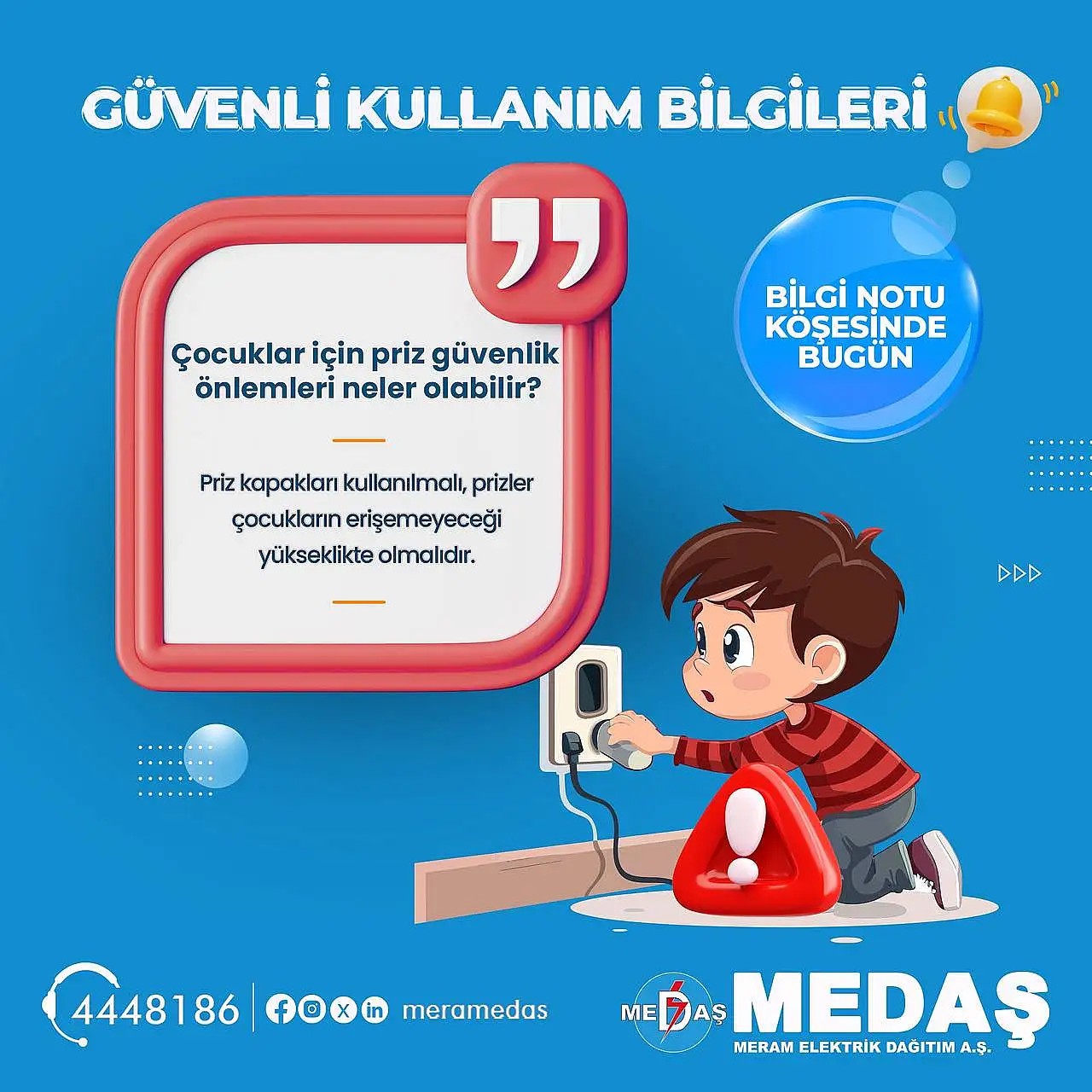 Meram Elektrik Dağıtım A.Ş. (MEDAŞ), güvenli elektrik kullanımı konusunda toplumu bilgilendirmeye devam ediyor. Şirketin sosyal medya hesaplarından yaptığı paylaşımda, özellikle çocukların güvenliği için evlerde alınması gereken basit ama hayati önlemlere dikkat çekildi.