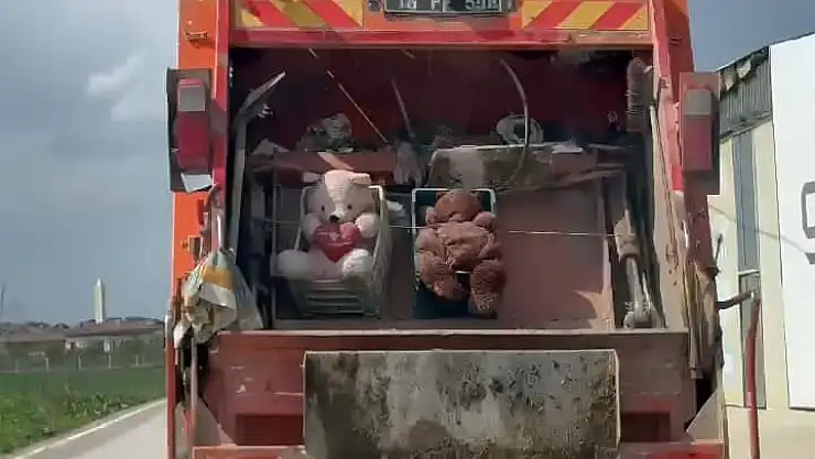 Çöp kovalarındaki çöpleri kamyonun arkasına atan görevliler, çöpe atılan iki oyuncak ayıyı kamyonun içine atmaya kıyamayınca ortaya güzel görüntüler çıktı. Görevliler ayıları kamyonun arkasına astılar. O anlar, Ortaköy Mahallesi'nde bir sürücünün amatör kamerasına yansıdı.