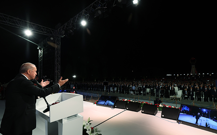 Erdoğan, Cumhurbaşkanlığı Külliyesi'nde düzenlenen "15 Temmuz Demokrasi ve Milli Birlik Günü Anma Programı"na katıldı.