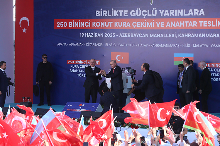 Cumhurbaşkanı Recep Tayyip Erdoğan, Azerbaycan Cumhurbaşkanı İlham Aliyev ile Kahramanmaraş'taki Azerbaycan Mahallesi'nde 250 Bininci Afet Konutu Anahtar Teslimi ve Kura Çekim Töreni'ne katıldı.Konuşmasında, Azerbaycan Cumhurbaşkanı Aliyev'i Kahramanmaraş