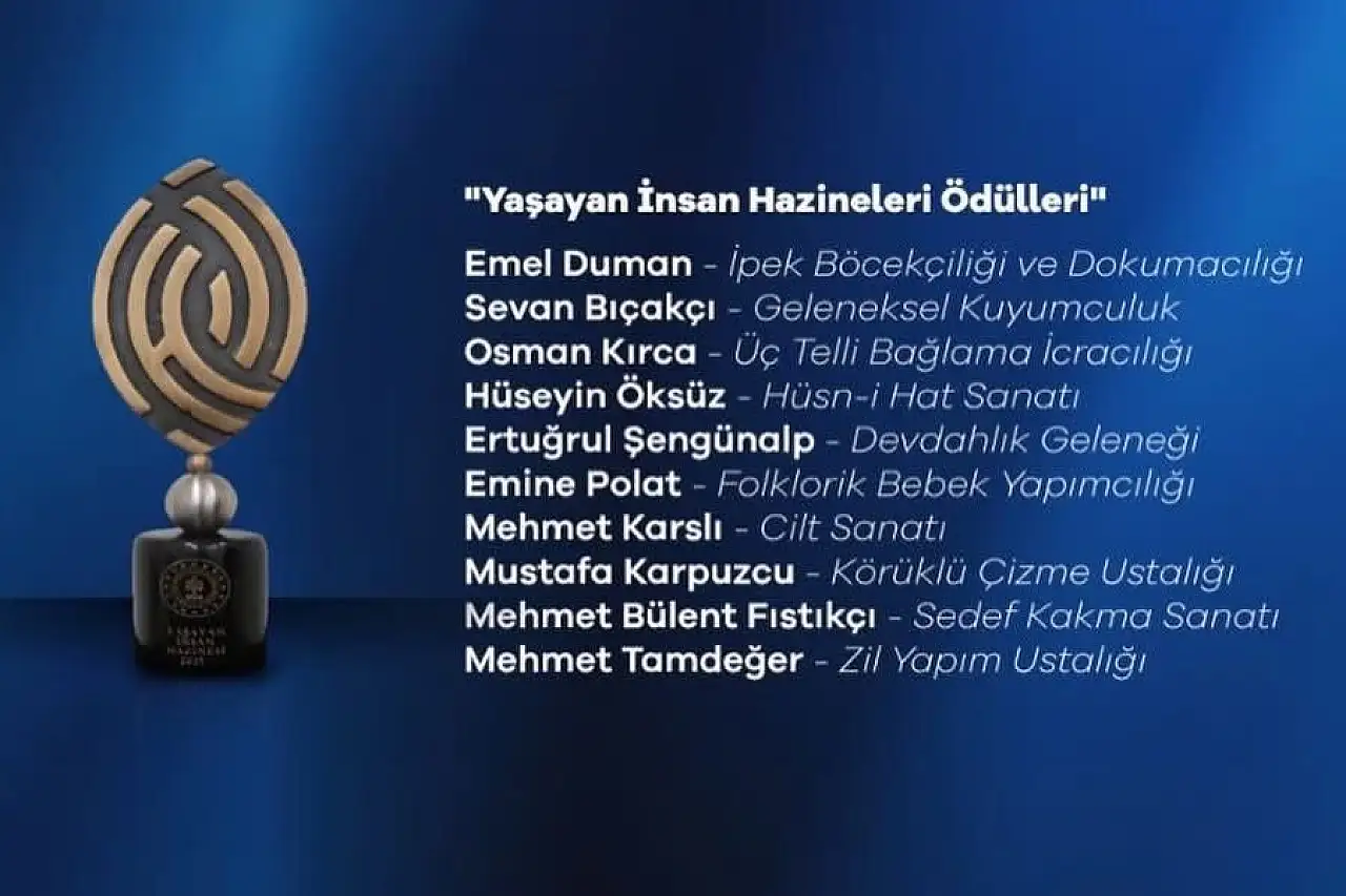 Cumhurbaşkanı Erdoğan, bu anlayışla 2008'den beri sahip oldukları sanat birikimini nesilden nesile aktaran sanatçı ve ustaları "Yaşayan İnsan Hazineleri" ilan ettiklerini vurguladı. Bugüne kadar 90 kişiyi ve iki grubu Yaşayan İnsan Hazineleri Listesi'ne aldıklarını anlatan Erdoğan, "Geçtiğimiz sene 25 usta ve sanatçımızı bu listeye dahil ettik. Bu yıl ise listemize 10 yeni isim daha ekliyor, Yaşayan İnsan Hazineleri varlığımızı daha da zenginleştiriyoruz." dedi.