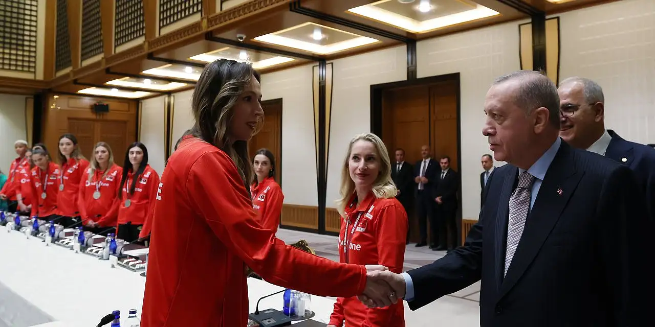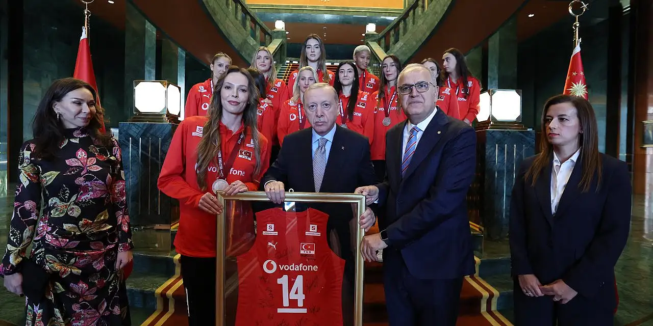 Basına kapalı gerçekleşen kabulde, takım kaptanlarından Eda Erdem, Cumhurbaşkanı Erdoğan’a imzalı forma hediye etti.