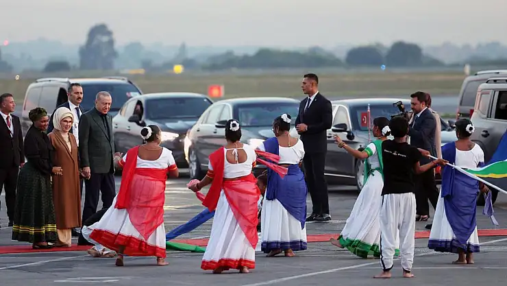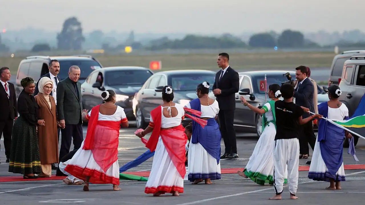 Cumhurbaşkanı Erdoğan'ı, OR Tambo Uluslararası Havalimanı'nda Güney Afrika Cumhuriyeti Konut, Su ve Esenlik Bakanı Thembisile Simelane, Türkiye'nin Pretorya Büyükelçisi Kezban Nilvana Darama Yıldırımgeç ile diğer ilgililer karşıladı.